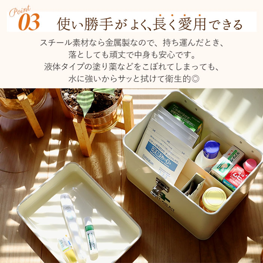 ・上部フタに持ち手ハンドル付きで、持ち運びにも便利。お子さまが外遊びで怪我をした時にもすぐに持ち出せる。