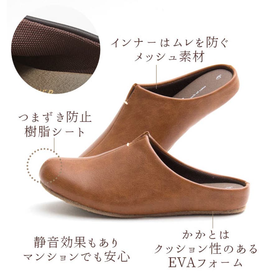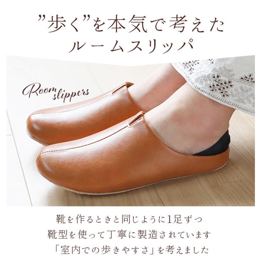 フェイクレザーで高級感のあるおしゃれなデザインと、履き心地も考えられたルームシューズでお客様を「足元からおもてなし」。