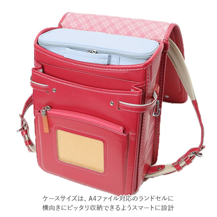 ・ケースサイズは、A4ファイル対応のランドセルに横向きにピッタリ収納できるようスマートに設計。ハンドル付きで持ち運びにも便利。