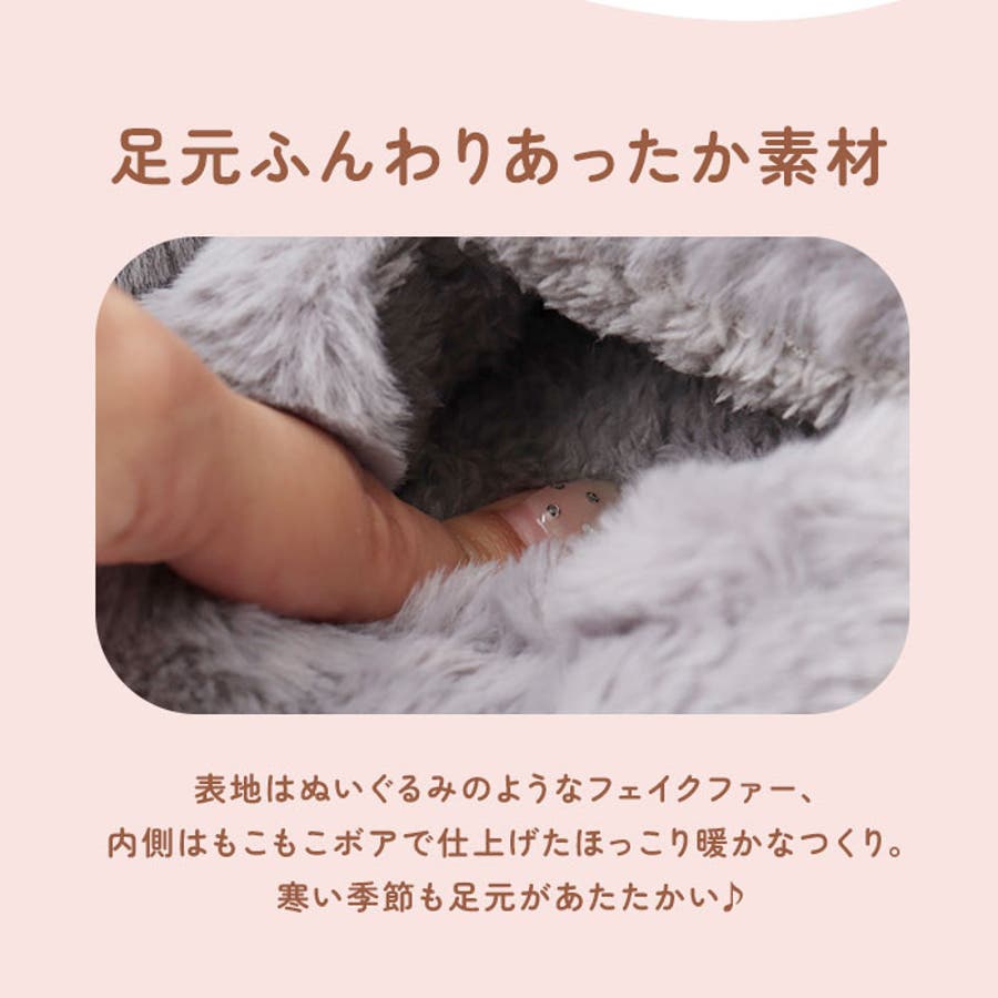 ・表地はぬいぐるみのようなフェイクファー、内側はもこもこボアで仕上げたほっこり暖かなつくり。