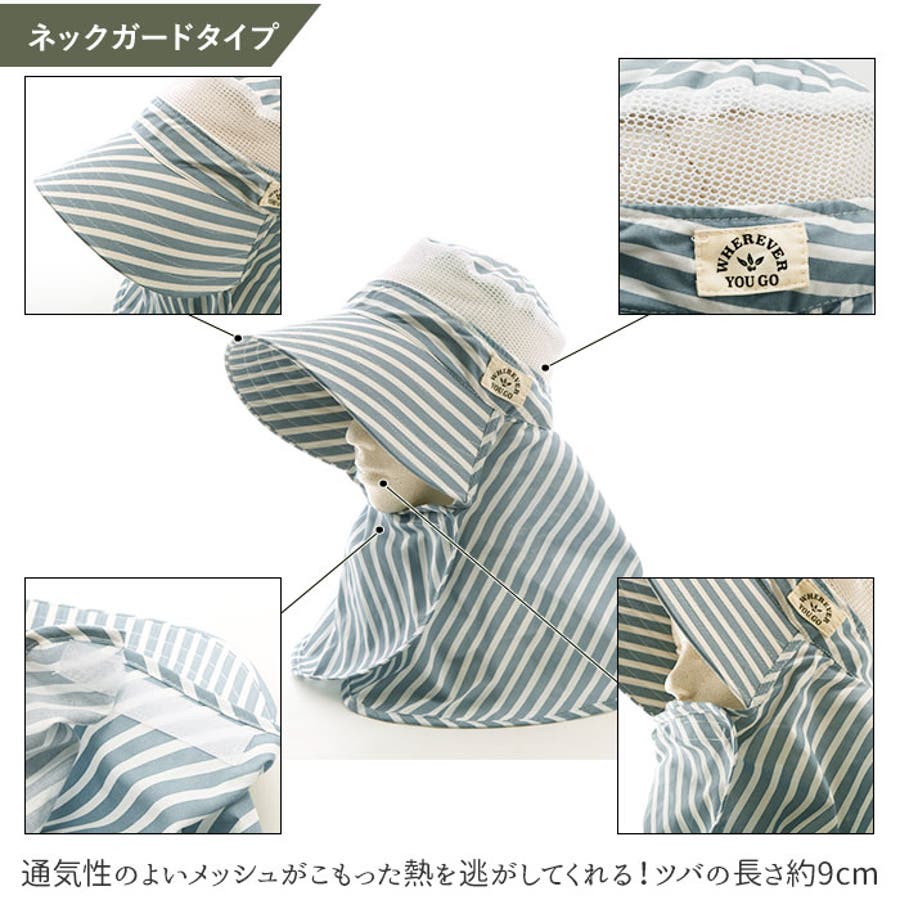 ・ネックガードタイプ:フラップが口元までの広い範囲をカバー!首とデコルテをしっかりガード。通気性のよいメッシュがこもった熱を逃がしてくれる。ツバの長さ約9cm。