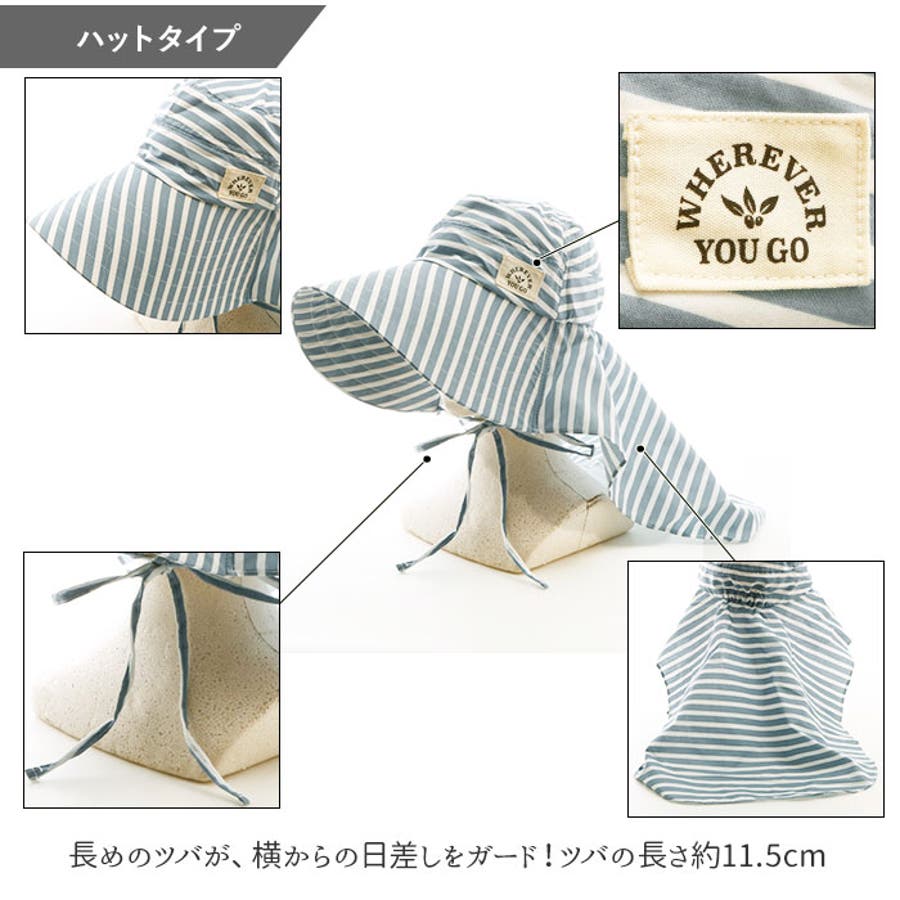 ・ハットタイプ:ファッション帽子のように普段使いしやすい形。布が顔に沿うようになっていて、こめかみ部分から顔のサイドまでをカバー。長めのツバが、横からの日差しをガード!ツバの長さ約11.5cm。