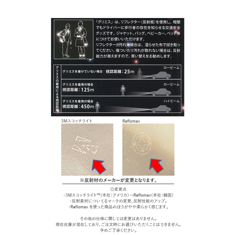 ・グリミスのリフレクター素材は、ヨーロッパ規格(※)に準拠して制作された、高品質な反射素材「マイクロプリズム」の再帰性反射材を使用。通常のカプセルレンズタイプの反射シートの約3倍の輝度を持つ素材。