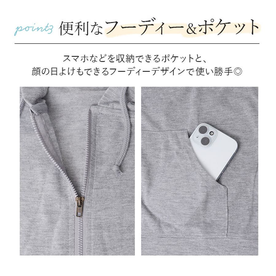 ・スマホなどを収納できるポケットと、顔の日よけもできるフーディーデザインで使い勝手◎