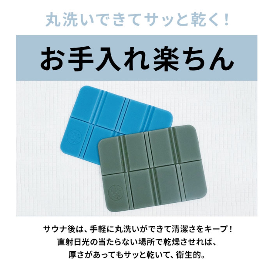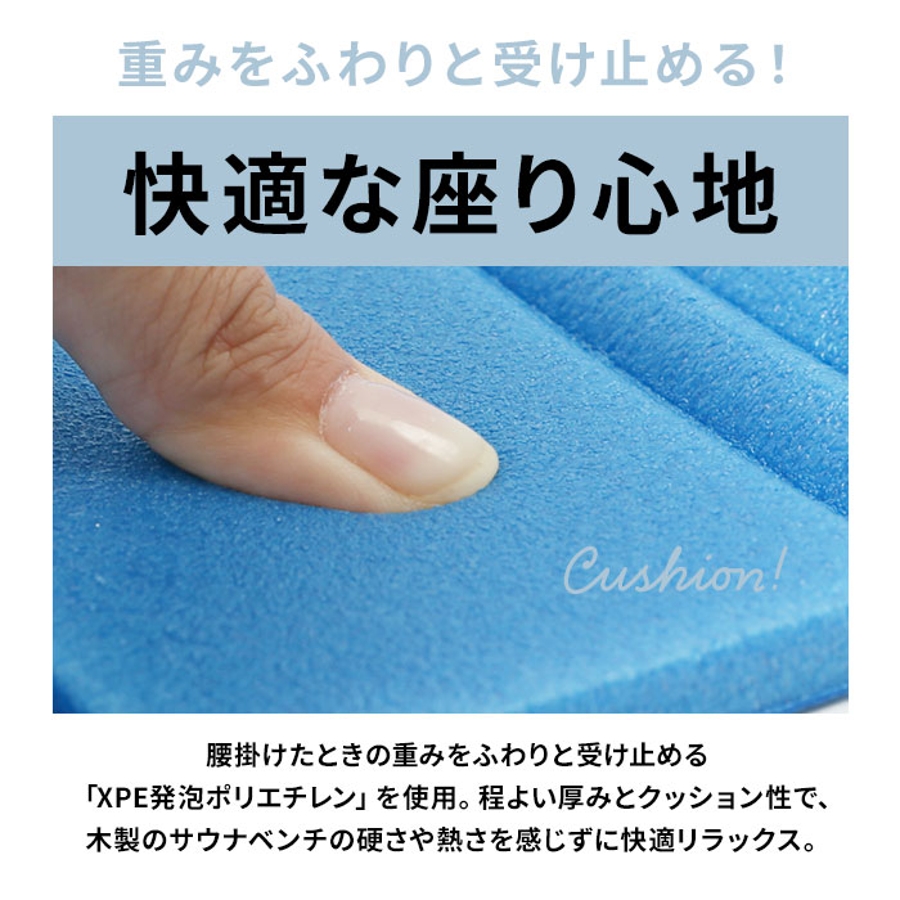 ・サ活マットの素材には、腰掛けたときのお尻の重みをふわりと受け止める「XPE発泡ポリエチレン」を使用。程よい厚みとクッション性で、木製のサウナベンチの硬さや熱さを感じずに快適リラックス。