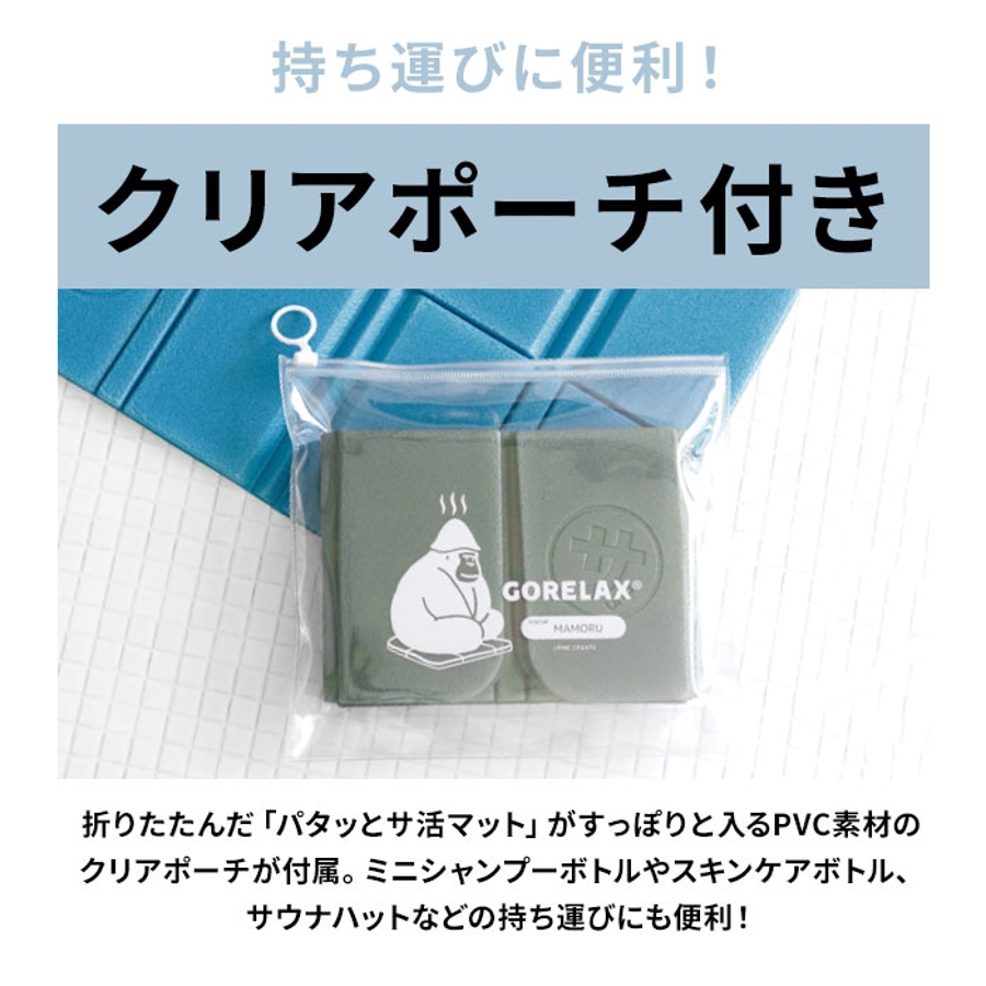 ・折りたたんだ「パタッとサ活マット」がすっぽりと入るPVC素材のクリアポーチが付属。ミニシャンプーボトルやスキンケアボトル、サウナハットなどの持ち運びにも便利!
