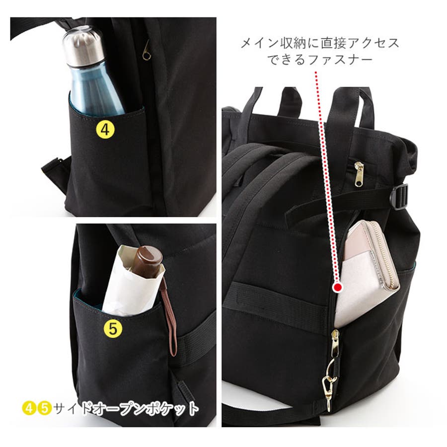 ・外側両サイドのオープンポケットには、500mlのペットボトルや折りたたみ傘などを収納できて、タウンユースだけでなく、アウトドアでも大活躍!