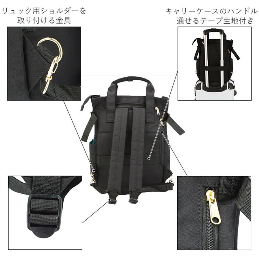 ・リュック背面側には、キャリーケースのハンドルに通すことのできるテープ生地付きで、旅行用のサブバッグにもオススメ。