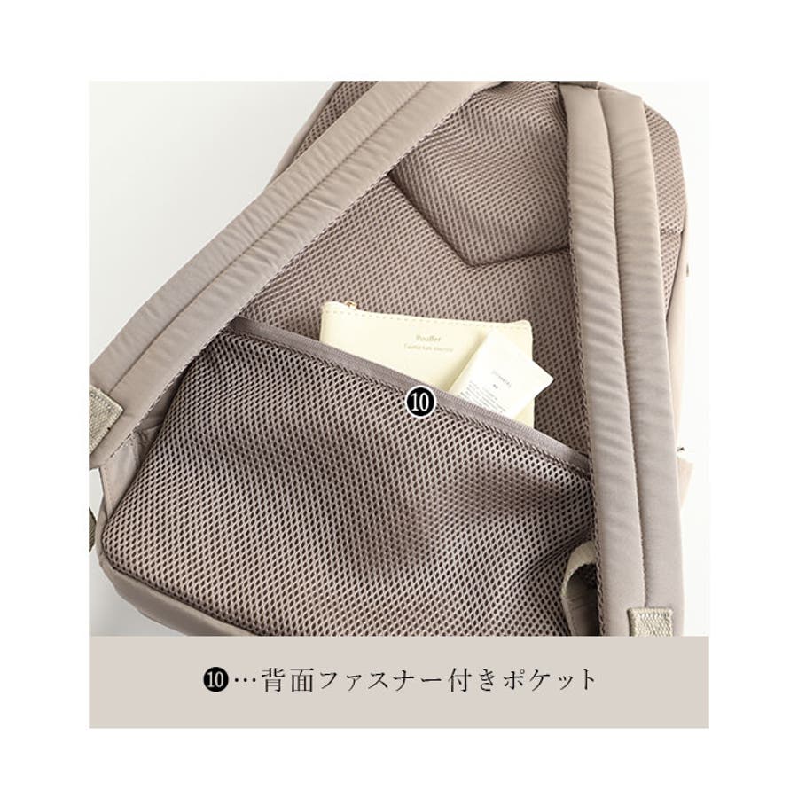 ・前面ポケットとメインルームの間には、横マチのあるファスナーポケットを配置。内側にメッシュポケット×2付きで、小物の整理がしやすい◎