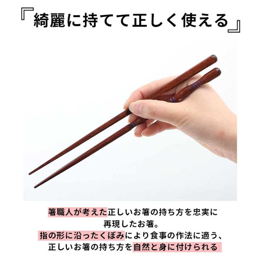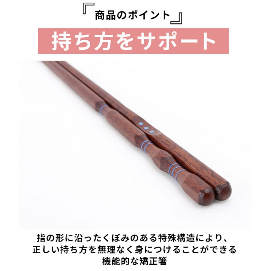 ・指の形に沿ったくぼみのある特殊構造により、正しい持ち方を無理なく身につけることができる機能的な矯正箸。
