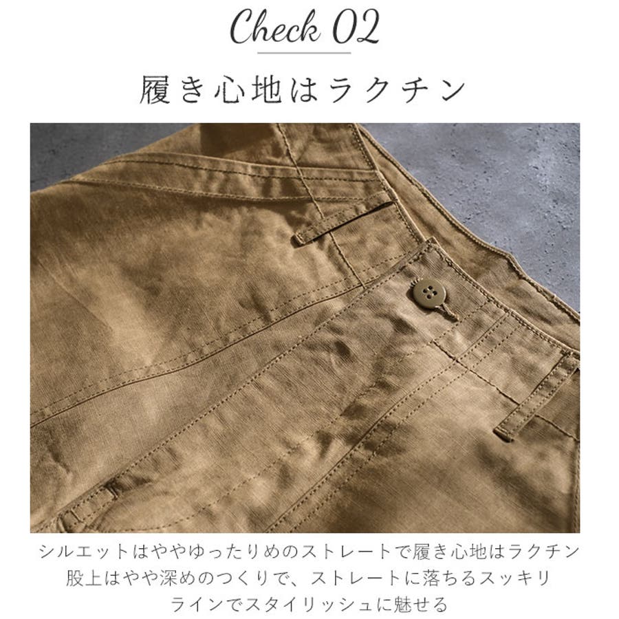 ・シルエットはややゆったりめのストレートで履き心地はラクチン。股上はやや深めのつくりで、ストレートに落ちるスッキリラインでスタイリッシュに魅せる。