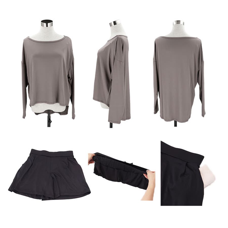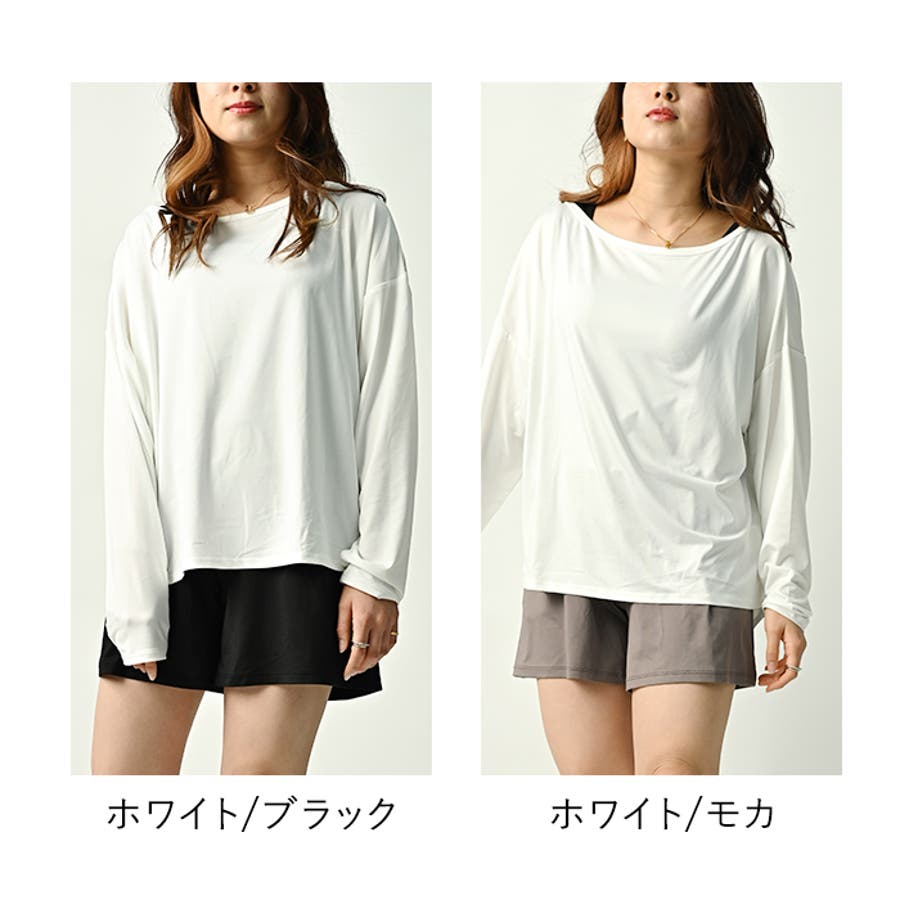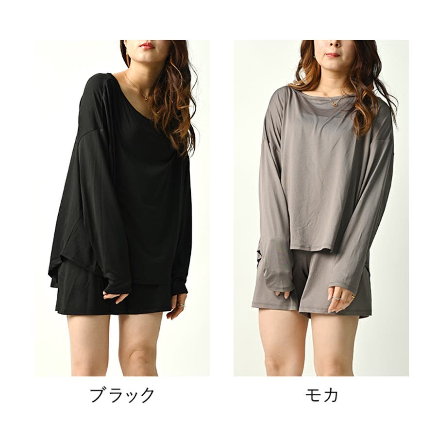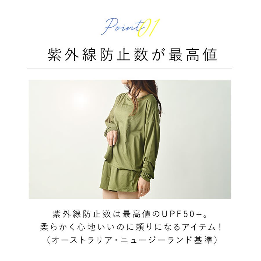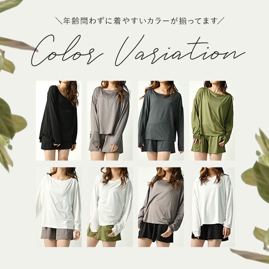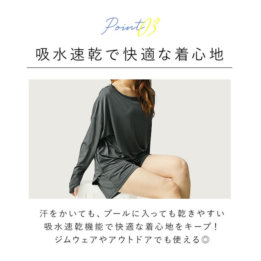 ・トップスはゆったり感のあるオフショルタイプ。後ろ丈が長めのデザインで、腰回りをカバー。フィンガーホール付きで手の甲までしっかり日焼け対策。