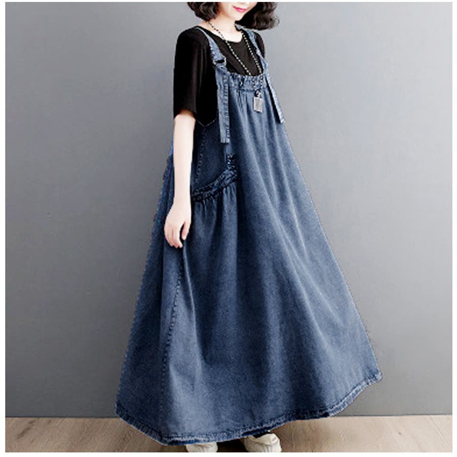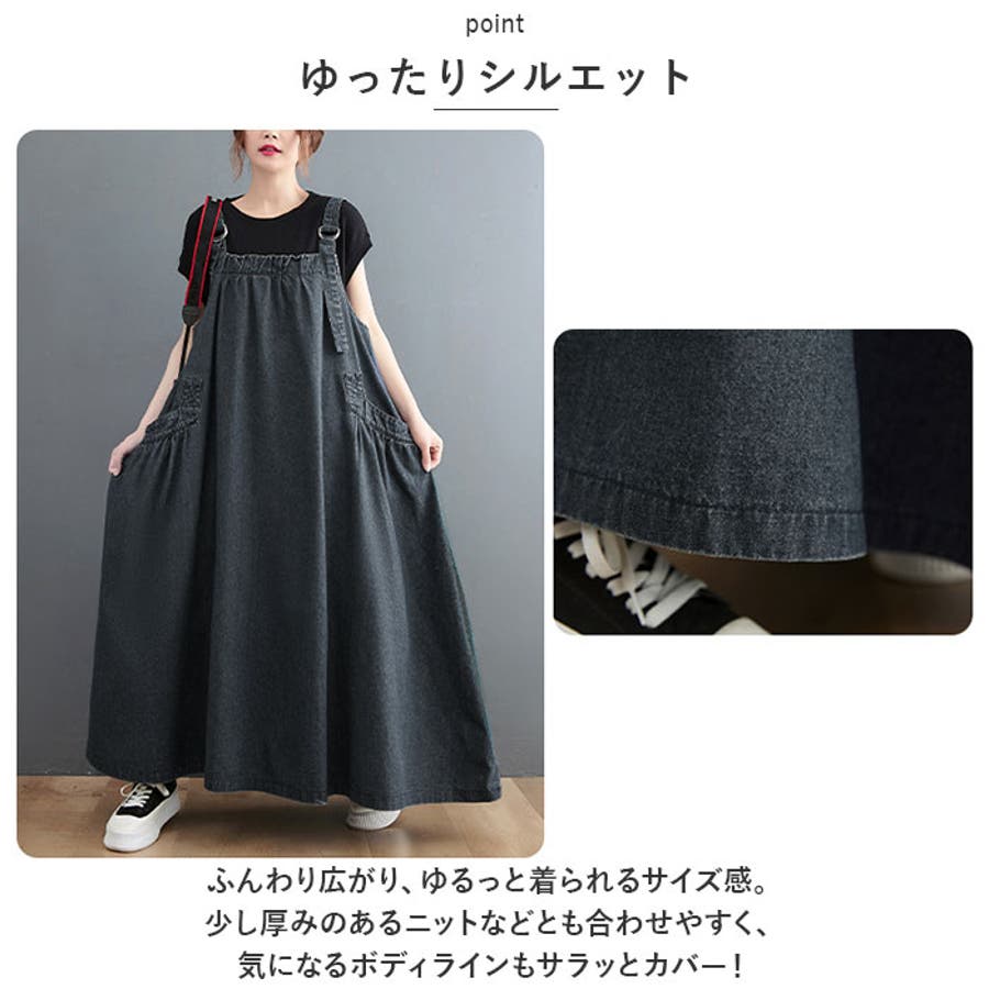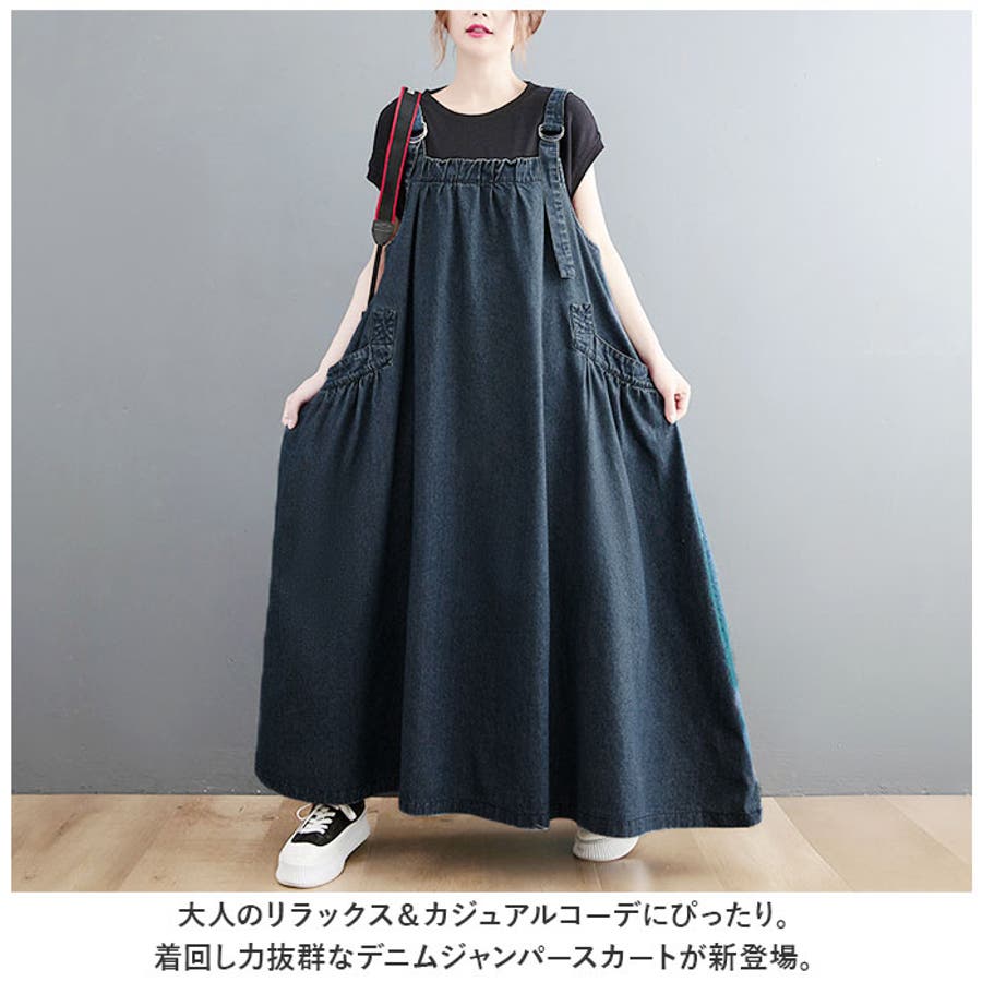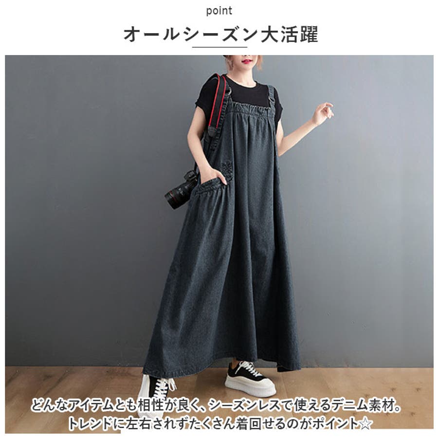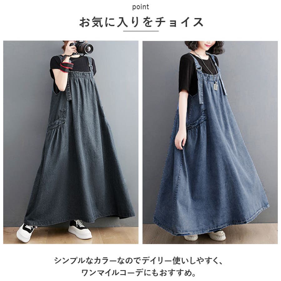 【キーワード】ジャンスカー デニムワンピース デニムワンピ オールインワン ワンピ マキシワンピース サロペット ロング ロング丈 ポケット付き ポケット Aライン ゆったり 大きいサイズ 夏 春 秋