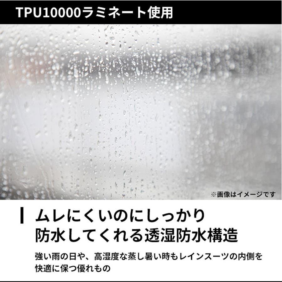 ・耐水圧10,000mm以上、透湿度5,000g/m2・24h。ムレにくいのにしっかり防水してくれる透湿防水構造。強い雨の日や、高湿度な蒸し暑い時もレインスーツの内側を快適に保つ優れもの。