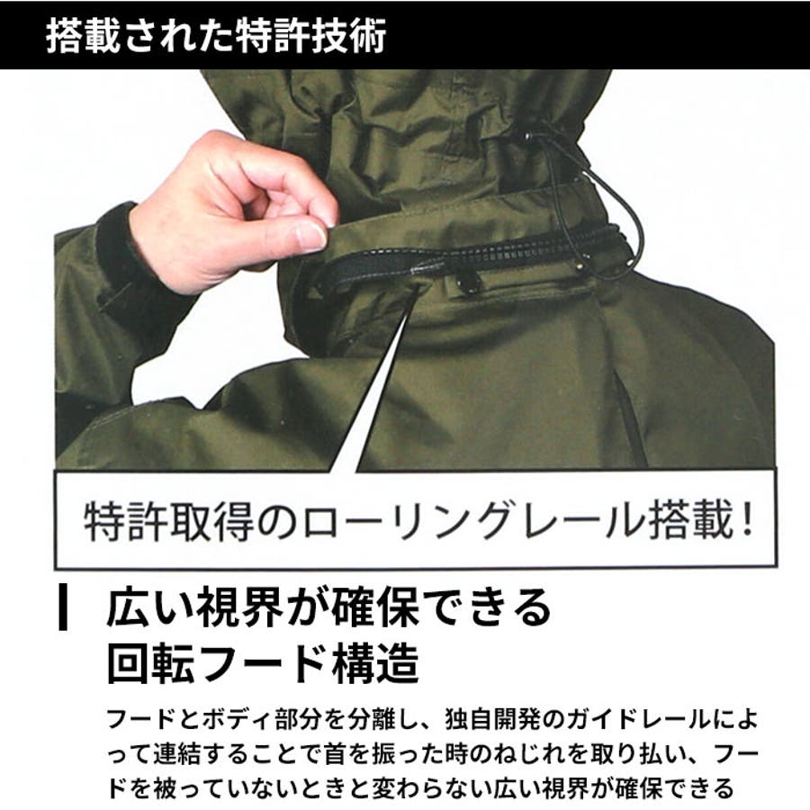 ・フードには、首を振った時のねじれを取り払い、フードを被っていないときと変わらない広い視界が確保できる回転フード構造を採用。