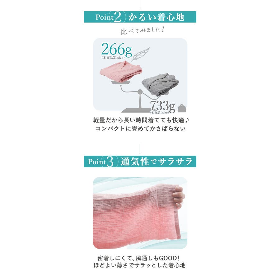・吸水性と保湿力を合わせ持つ、薄手の綿素材を使用。体を優しく包み込んでくれる、肌触りの良さもポイント。