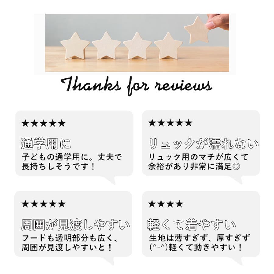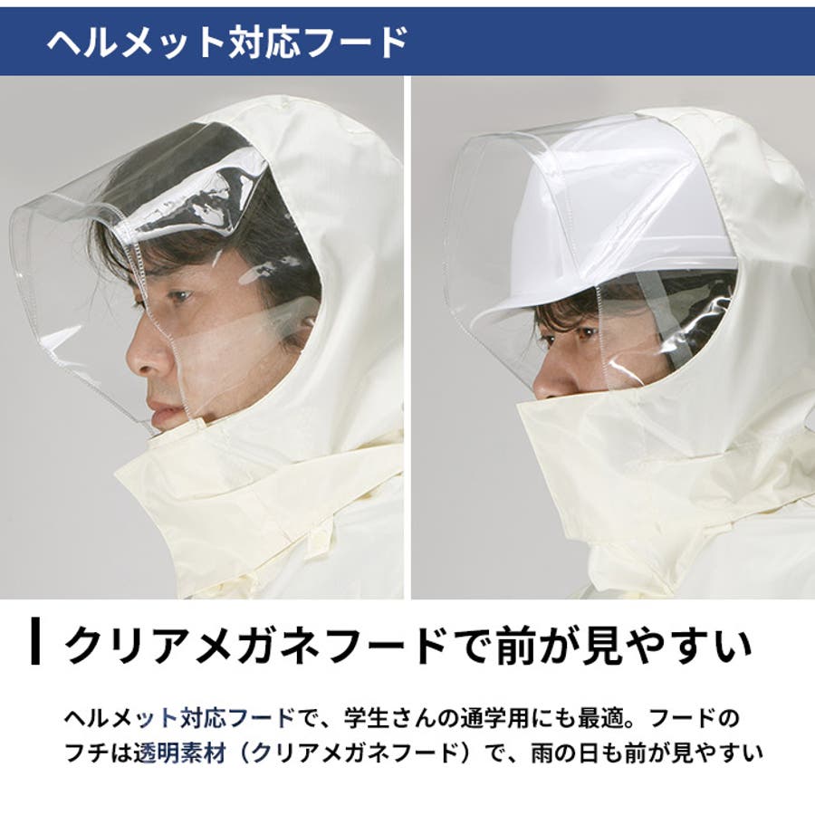 ・ヘルメット対応フードで、学生さんの通学用にも最適。フードのフチは透明素材(クリアメガネフード)で、雨の日も前が見やすい。