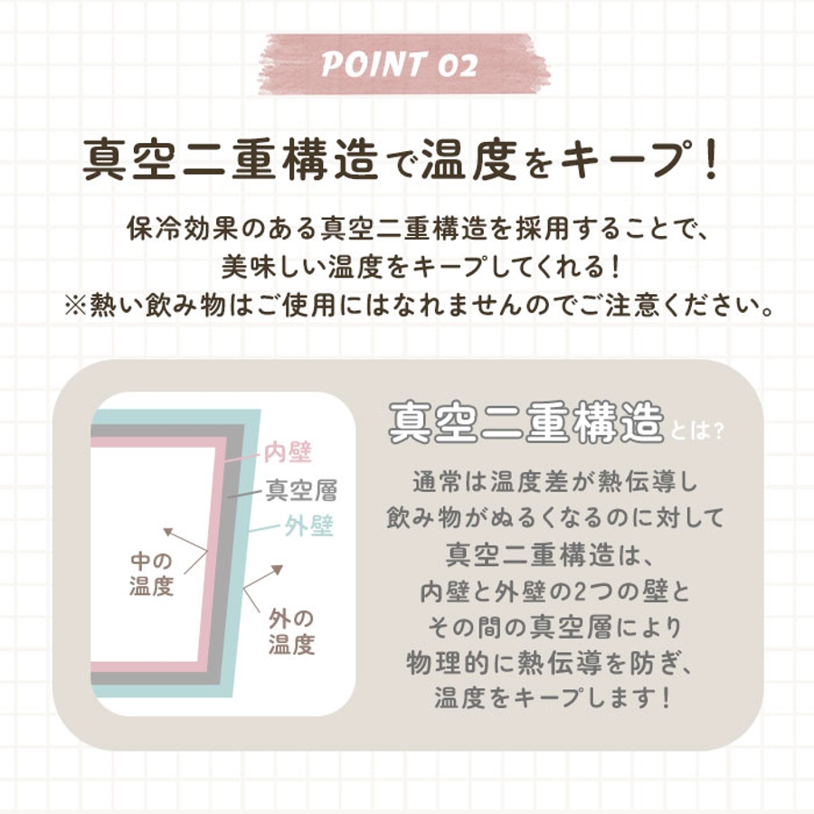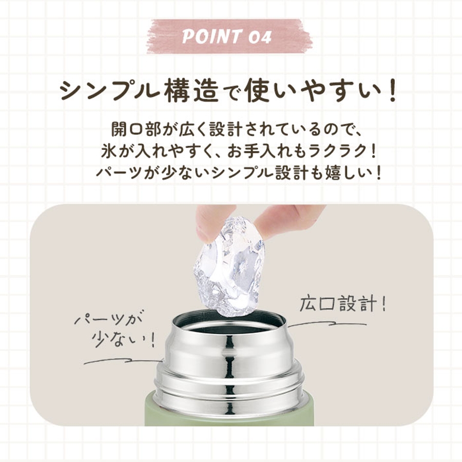 ・キャップユニットを外すとボトル開口部が広口になったワイド設計で、氷が入れやすい。真空二重構造で、保冷効果もしっかり長持ち◎(※保冷専用のため、熱い飲み物を入れてご使用にはなれませんのでご注意ください。)