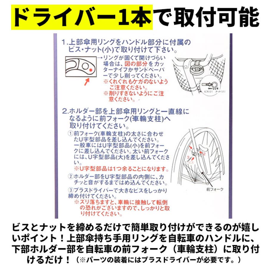 ・ビスとナットを締めるだけで簡単取り付けができるのが嬉しいポイント!上部傘持ち手用リングを自転車のハンドルに、下部ホルダー部を自転車の前フォーク(車輪支柱)に取り付けるだけ!(※パーツの装着にはプラスドライバーが必要です。)
