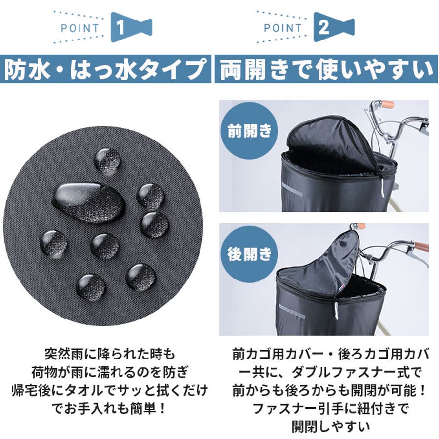・前カゴ用カバー・後ろカゴ用カバー共に、ダブルファスナー式で前からも後ろからも開閉が可能!ファスナー引手に紐付きで開閉しやすく、片手で自転車のハンドルを支えた状態でも荷物の出し入れがとってもラクちん。