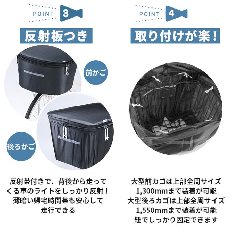 ・前カゴカバー正面と、後ろカゴカバー背面に反射帯付きで、背後から走ってくる車のライトをしっかり反射!薄暗い帰宅時間帯も安心して走行できる。