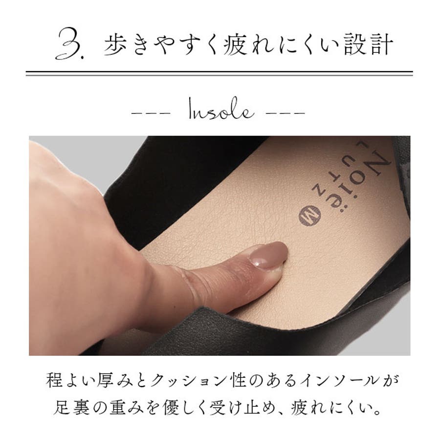・程よい厚みとクッション性のあるインソールが足裏の重みを優しく受け止めて、長時間履いても疲れにくく、快適な履き心地。