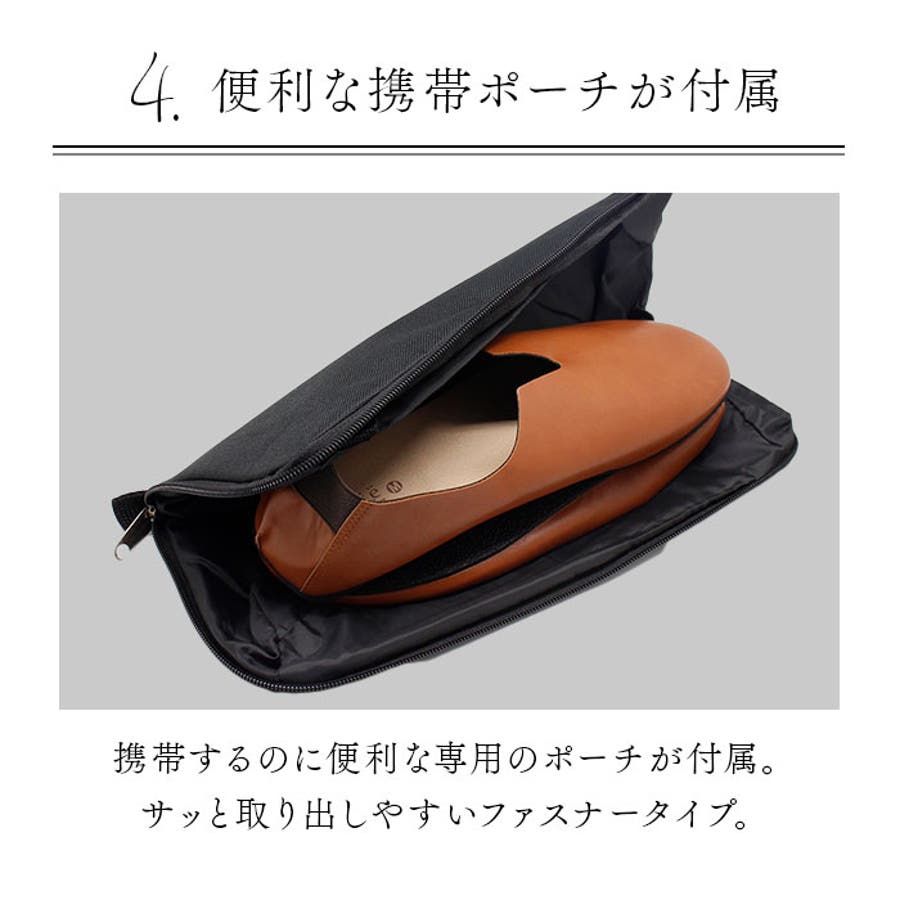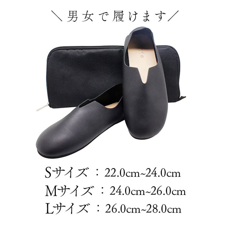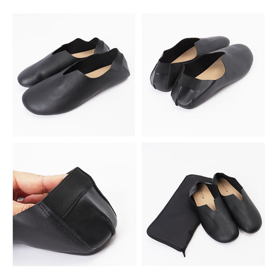 ・つま先のまぁるいフォルムとフェイクレザーの柔らかな質感が足に優しく馴染む、リラックス感のある携帯シューズ。