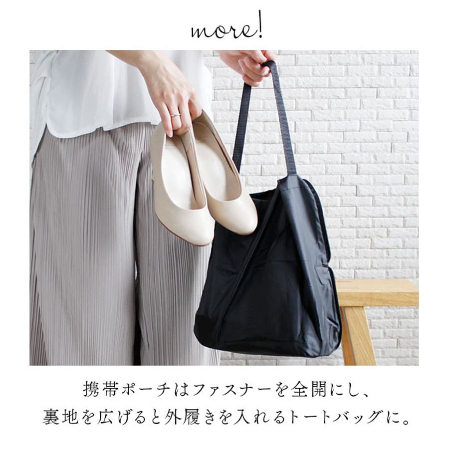 ・付属の収納ポーチのファスナーを広げると、履いてきたシューズが収納できるトートバッグに変身!訪問先での靴の持ち運びが楽ちん。