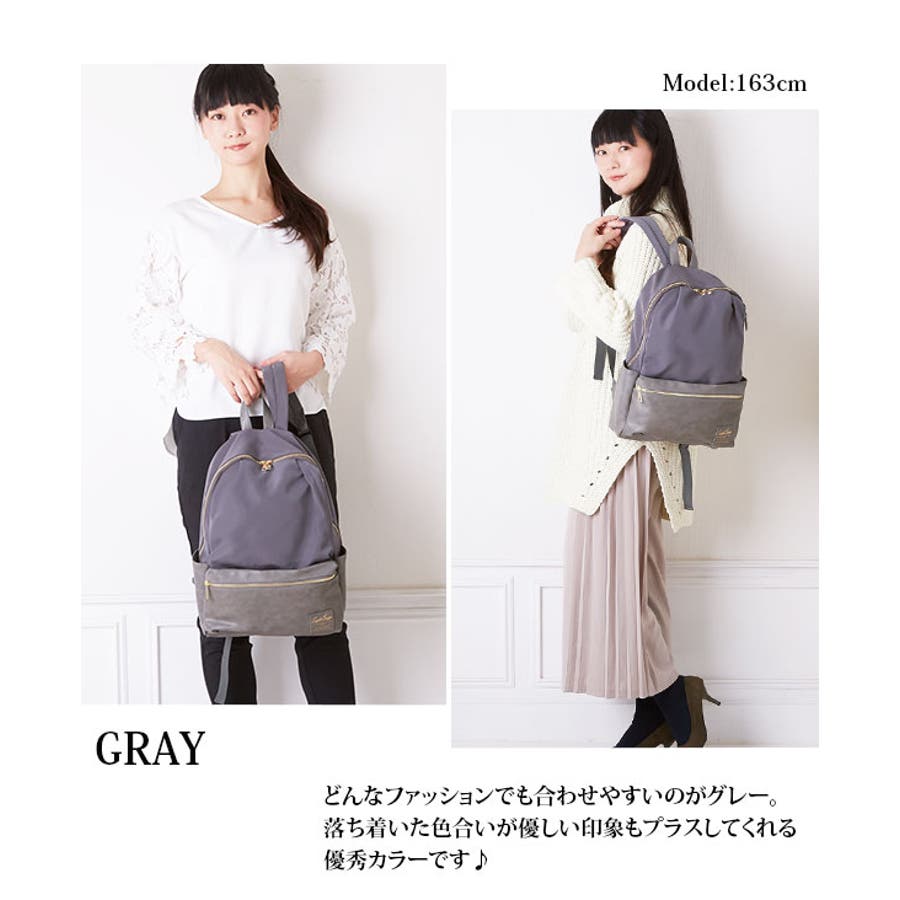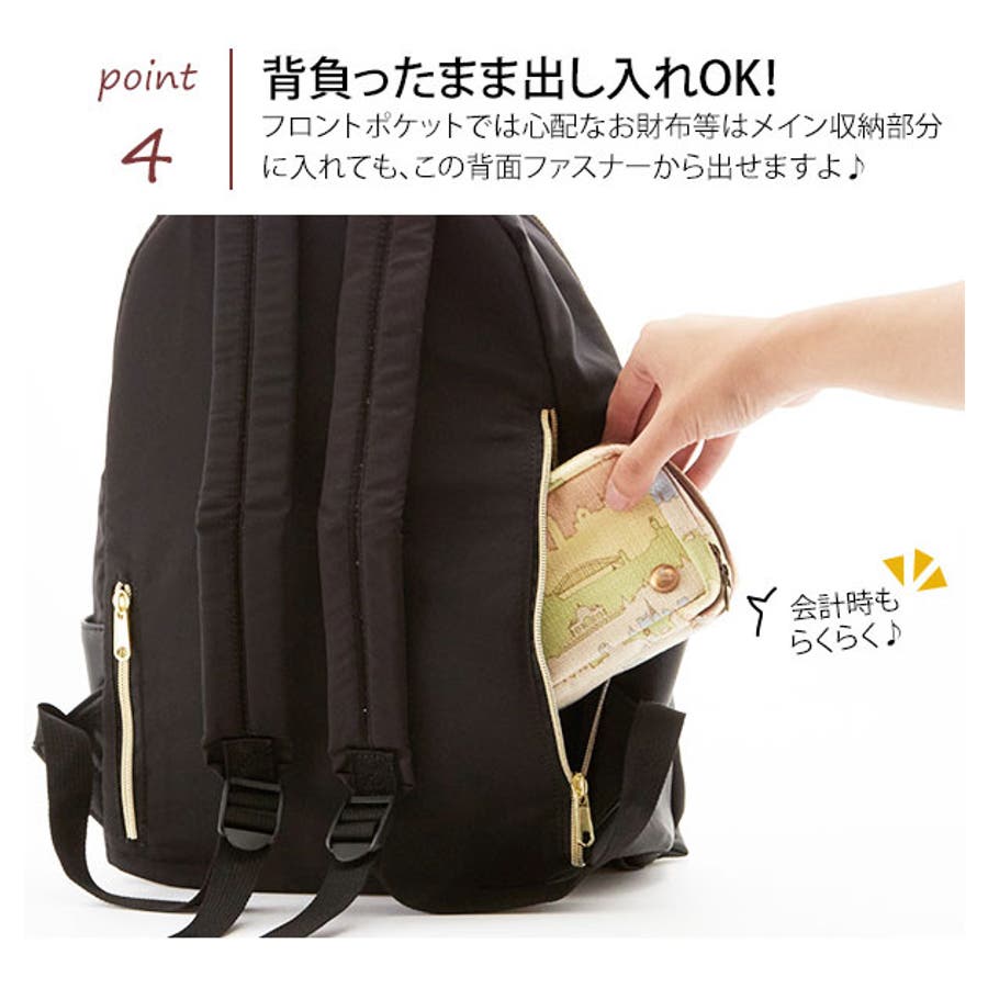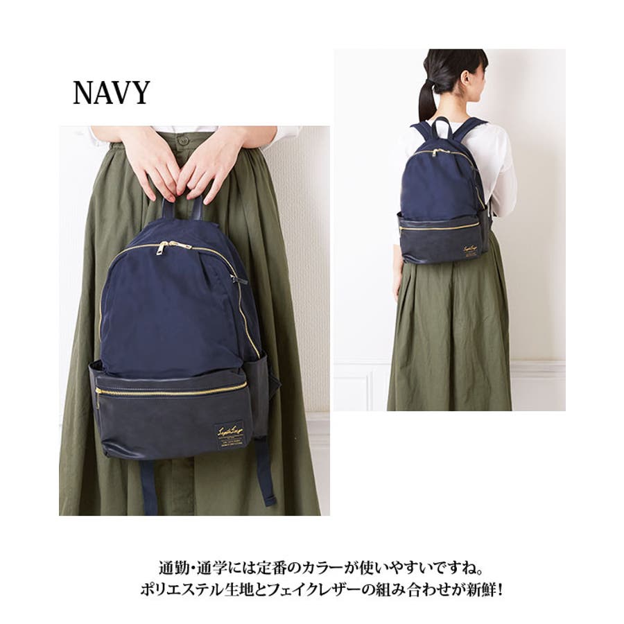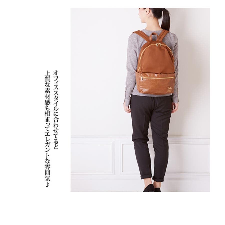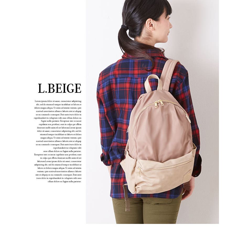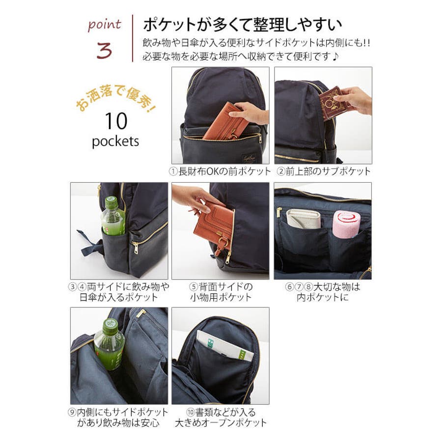 手触りの良いきめ細やかなポリエステル生地と上質な合成皮革を組み合わせ、カジュアルにもキレイめスタイルにも合わせやすい仕上がりです。A4サイズもすっぽり収まるサイズに、小物の整理に欠かせないポケットが10個!背面には、背負ったまま片手で出し入れできる直結ファスナーも付いていて、機能性にもこだわっています。
