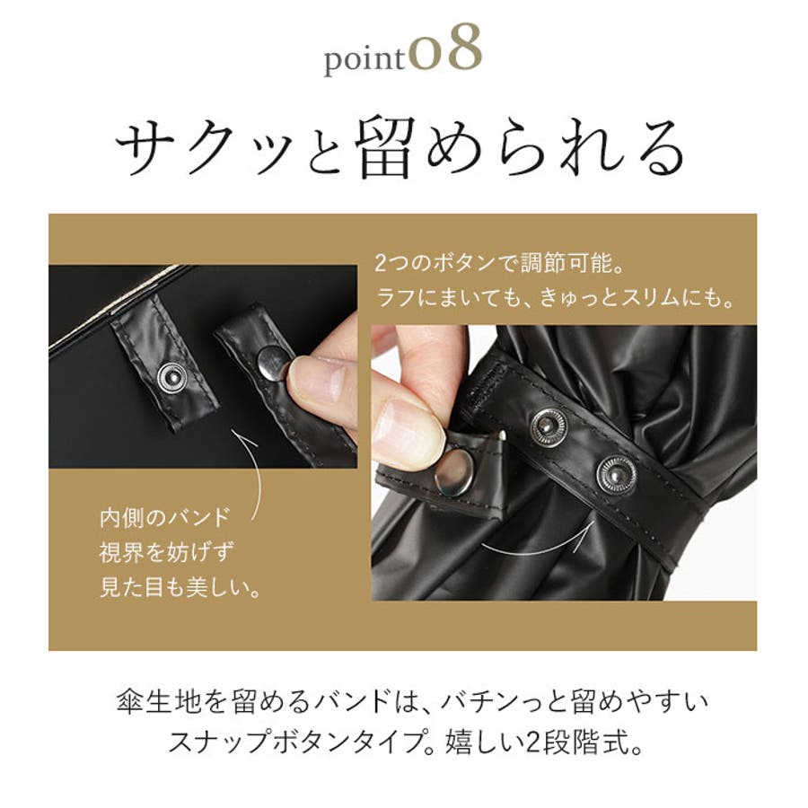 ・傘生地を留めるバンドは、バチンっと留めやすいスナップボタンタイプ。嬉しい2段階式。