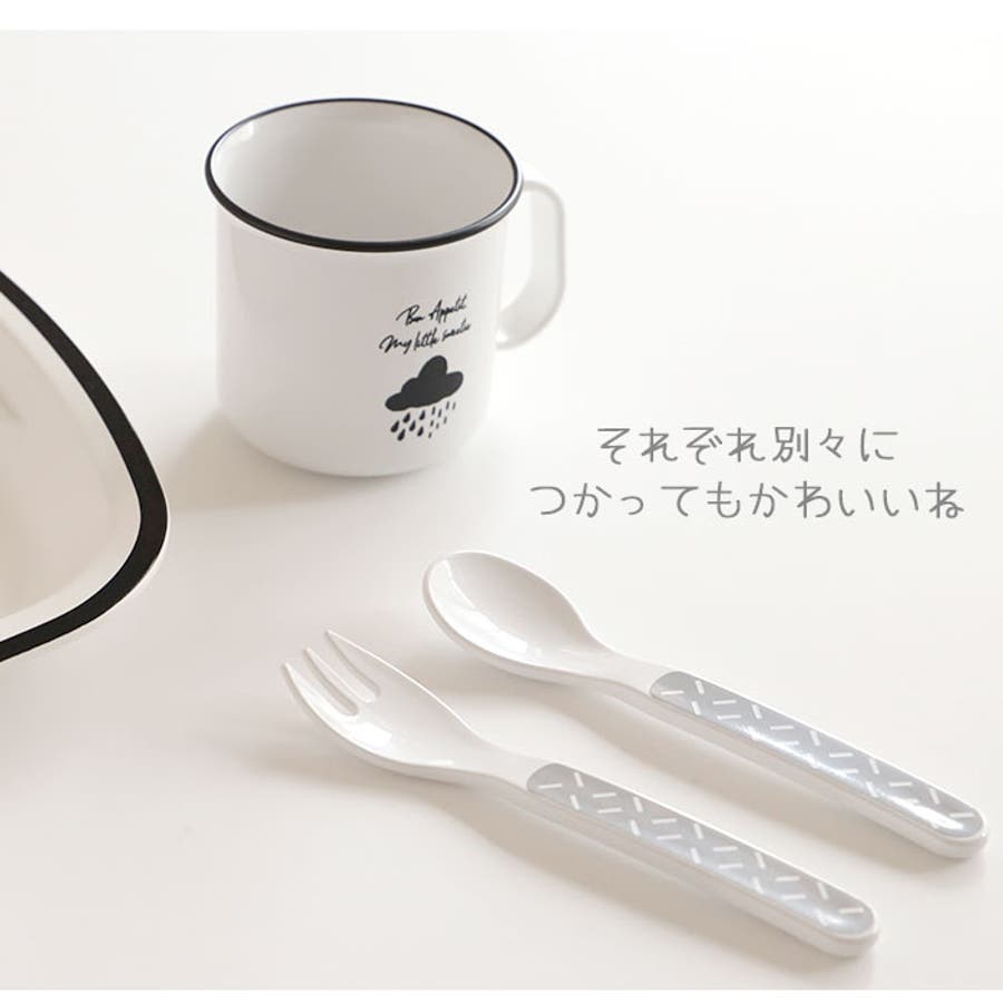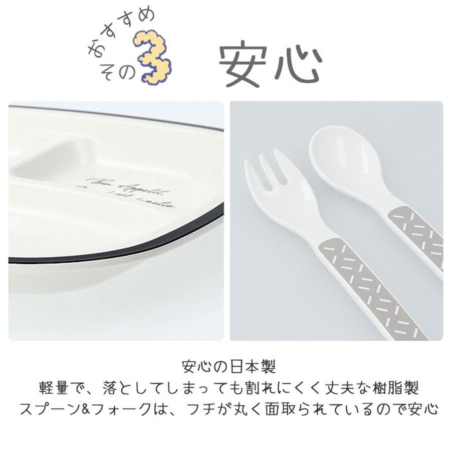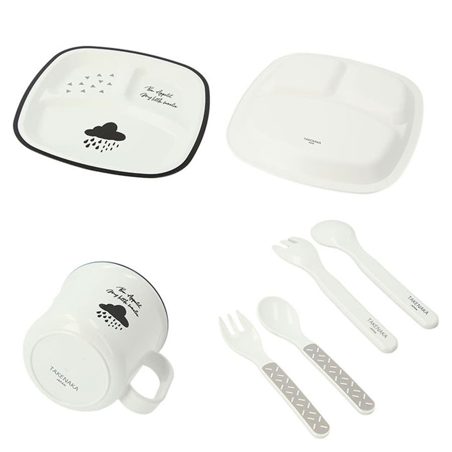 ・ランチプレート、キッズカップ、スプーン&フォークのセット。軽量で、落としてしまっても割れにくく丈夫な樹脂製。