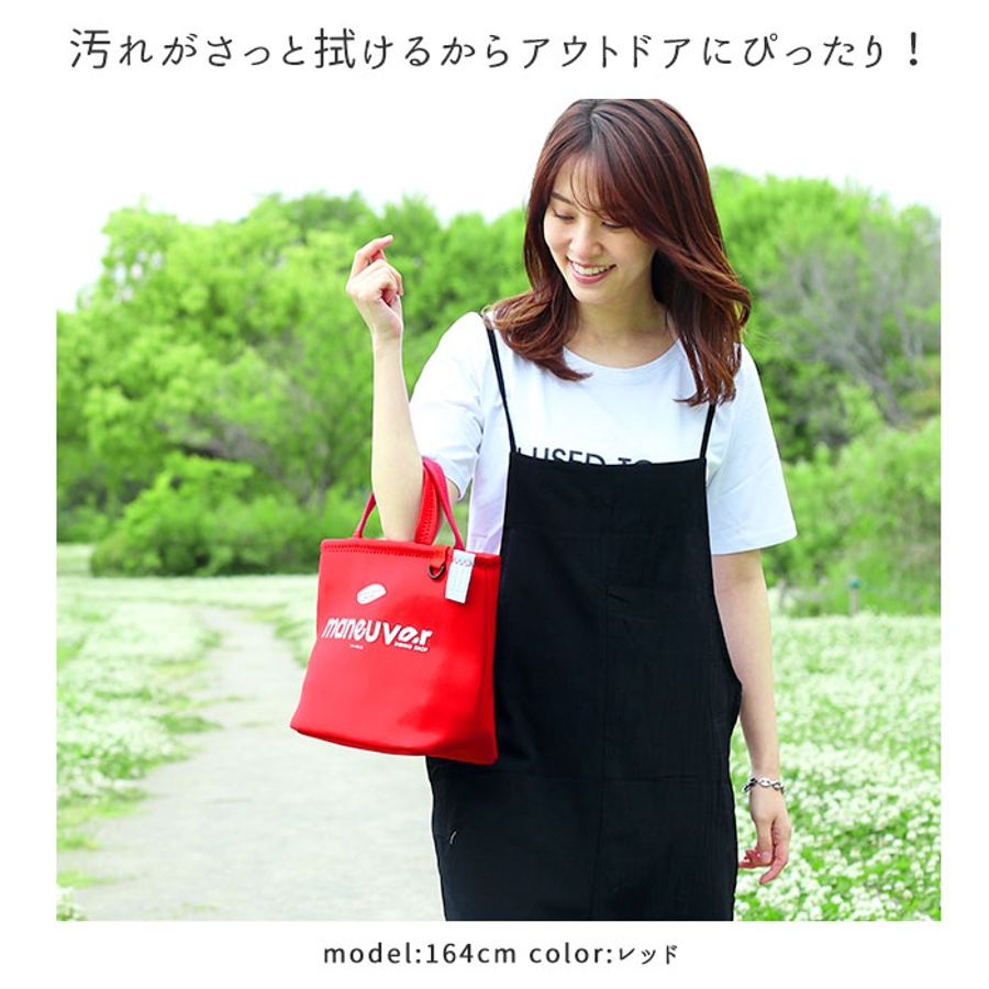 ・もちっと柔らか触感の生地に「maneuver」の白抜きロゴをスタイリッシュに配置し、開口部についたロゴ入りフラッグやDカンがデザインのワンポイントに!