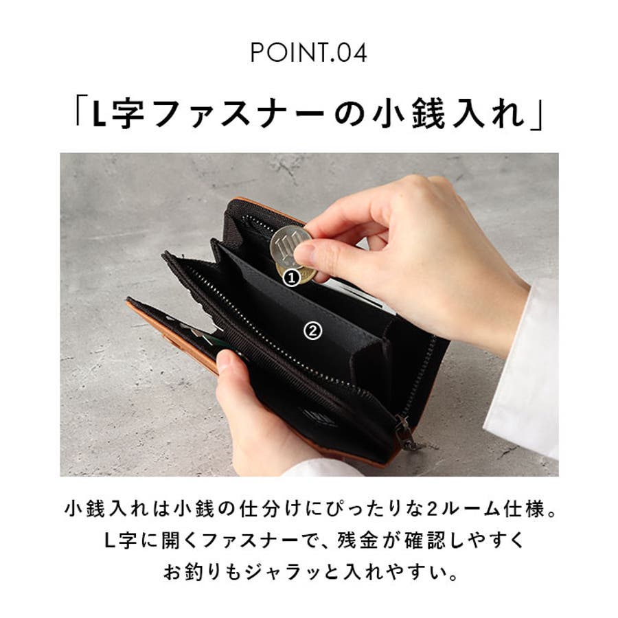 ・フラップを開いて右側には、L字型ファスナー式のコインスペースを装備。ジャバラ状に大きく開く2層式ポケットが使いやすさのヒミツ。