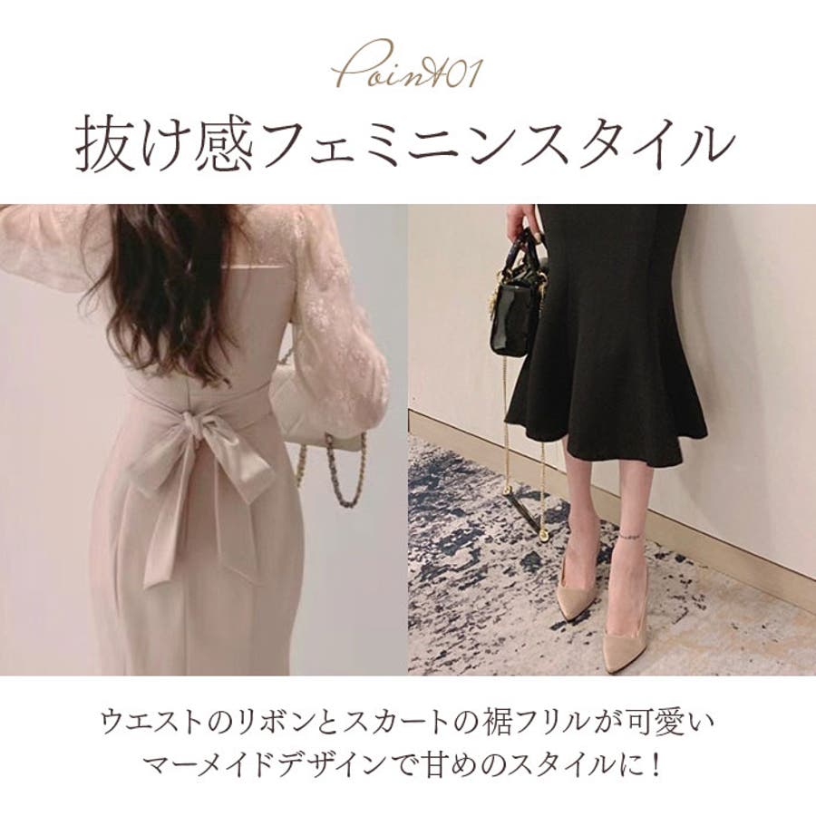 ・ウエストのリボンとスカートの裾フリルが可愛いマーメイドスタイルで甘めのデザインに。