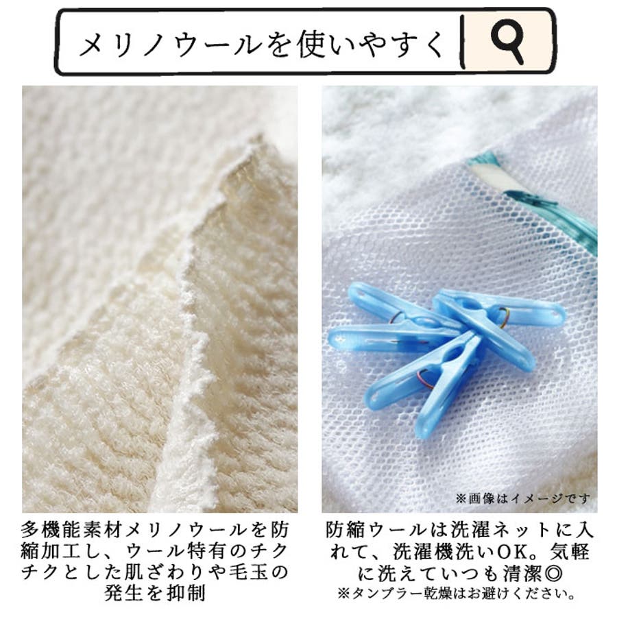 ・多機能素材メリノウールを防縮加工し、ウール特有のチクチクとした肌ざわりや毛玉の発生を抑制。