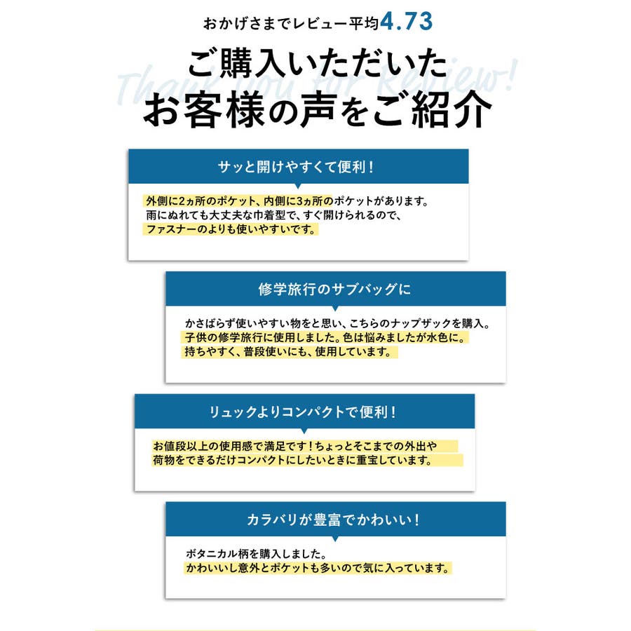かわいいです。早く使いたいですが、まだ、使う予定なし。大きさもちょうど良かったです。さん (30代 / 女性 )購入アイテム:商品 ナップザック[種類] ボタニカル