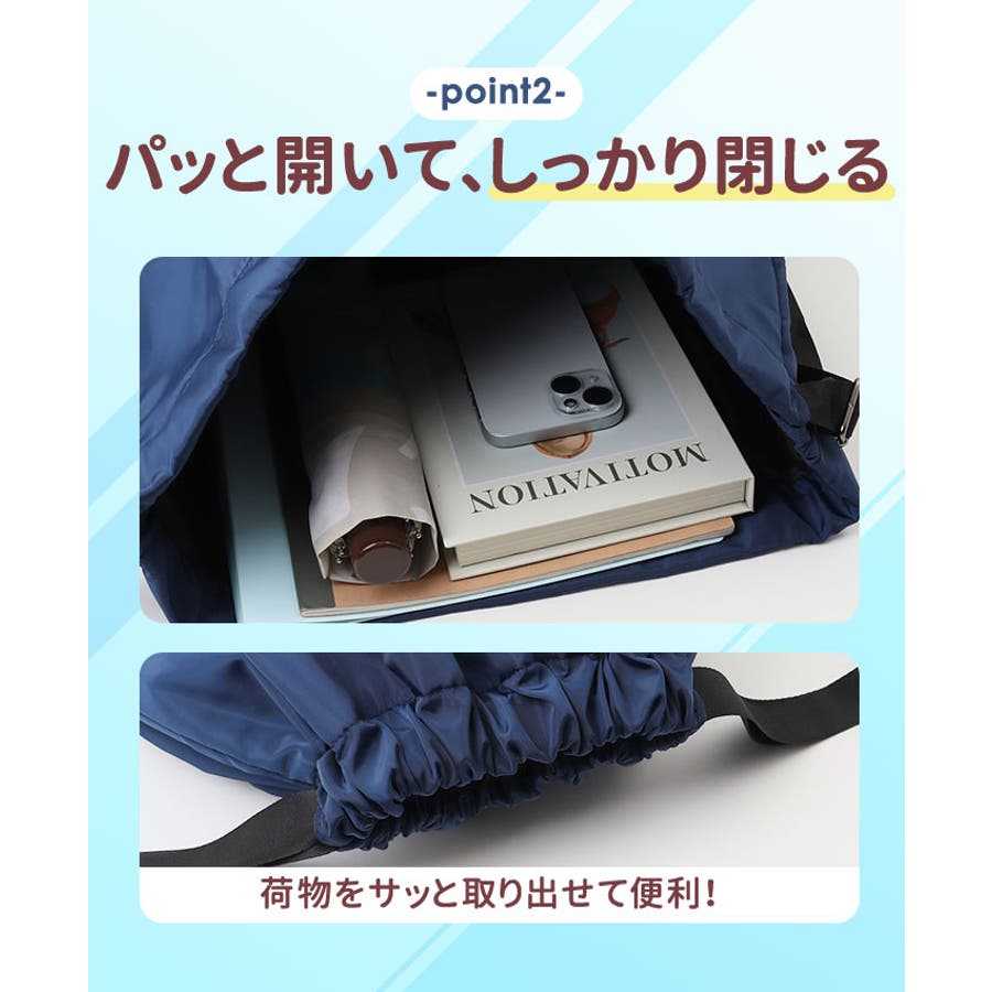 ・サイドの巾着紐をキュッと絞るだけのカンタン開閉。深さとマチがあり、A4サイズがすっぽり入り収納力も抜群!