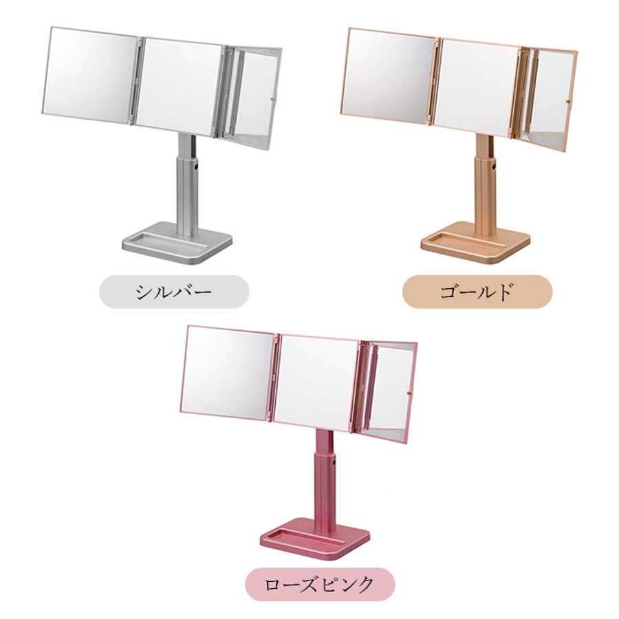 ・三面鏡仕様のミラーは鏡の向きが360度回転し、どんな角度でもピタッと止まる!高さは105mm内で調節可能、さらに角度調節もできるので、お好みの位置に合わせて使うことができる。