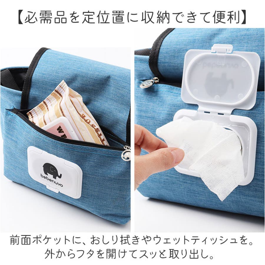 ・前面ポケットに、おしり拭きやウェットティッシュを。外からフタを開けてスッと取り出し。