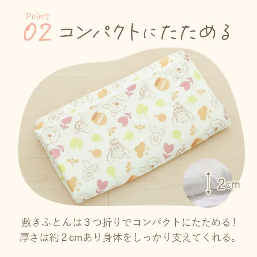 ・敷き布団は3つ折りでコンパクトにたためる作り。厚さは約2cmあり身体を支えてくれる。