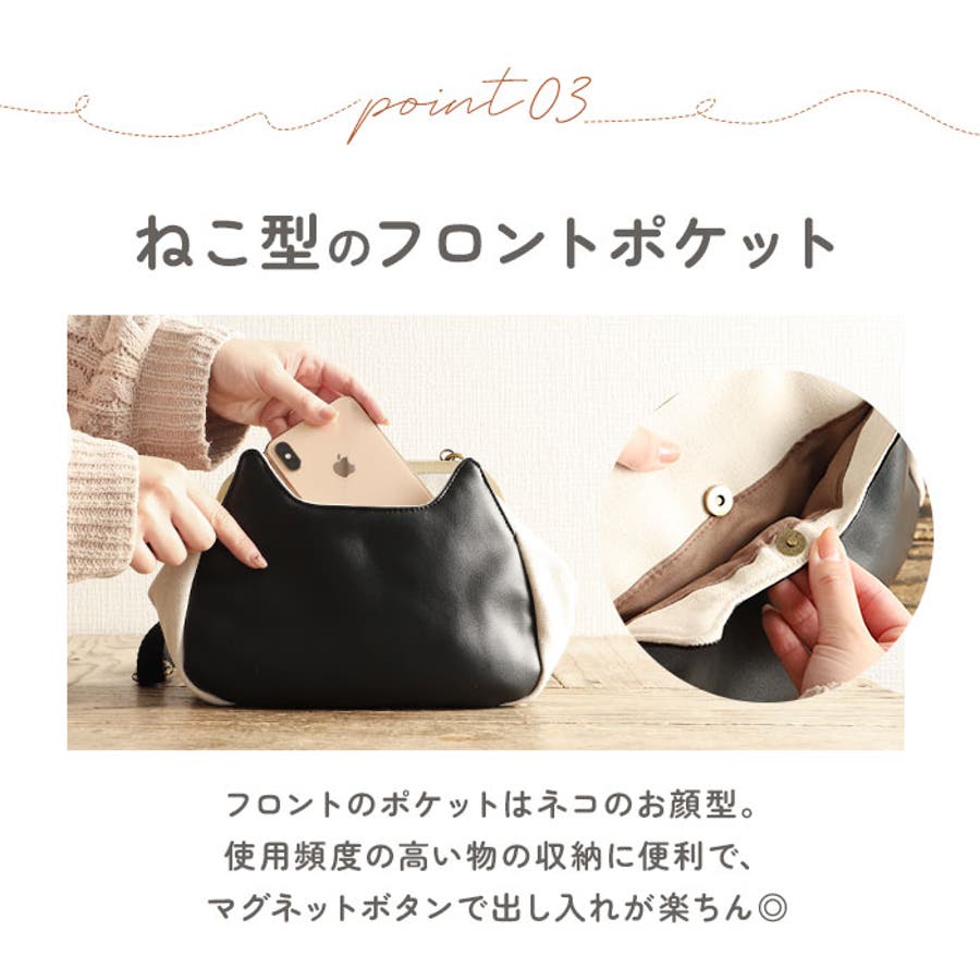 ・フロントのポケットはネコのお顔型☆落ち着きのあるフェイクレザーで仕上げているので、存在感を出しすぎず年代問わず使いやすい!