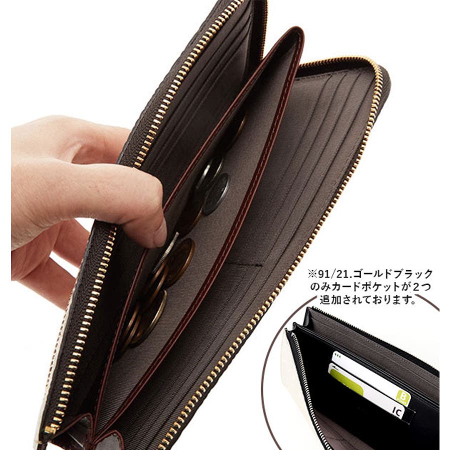 金属に刻印をしているような光沢を放つクラフトレザー。シャープな輝きのゴールドが美しい。L字ファスナーで開くメインは、中央にフリースペースがあり、コインを収納すればさっと取り出せる仕様に。カードケースも豊富で使い勝手バツグンです!