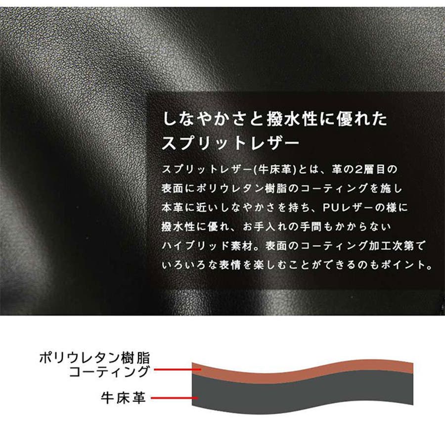 ・さらに革の2層目の表面に樹脂コーティングを施すことで、撥水性と耐久性がアップ。(※完全防水ではありません。また濡れると色移りや色落ちする場合等もあるため、ご注意ください。)