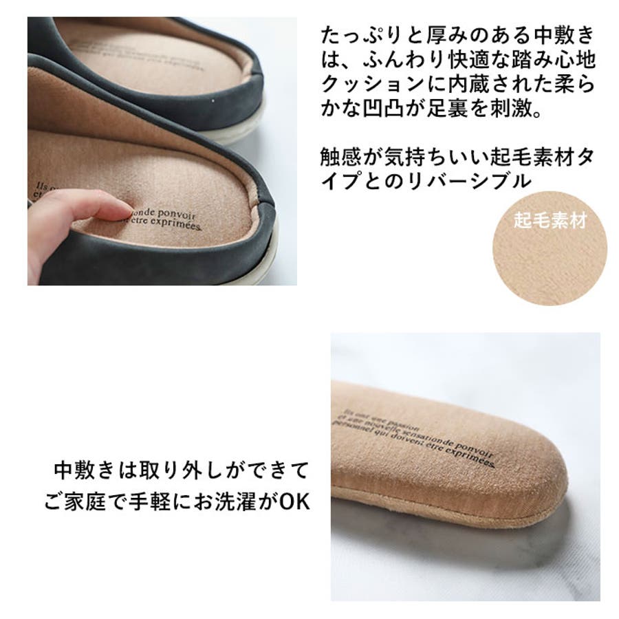 ・たっぷりと厚みのある中敷きは、ふんわり快適な踏み心地。クッションに内蔵された柔らかな凹凸が足裏を刺激して、自然とリラックス♪中敷きを裏返せば、滑らかな触感が気持ちいい起毛素材タイプも試せる!