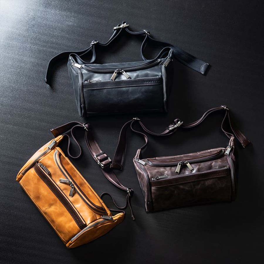 ・メイン素材にプルアップさせた(折り曲げたりすると独特な濃淡やシワが現れる)牛革、附属には深みと透明感のある牛ヌメ革を使用した、横型ボディバッグです。