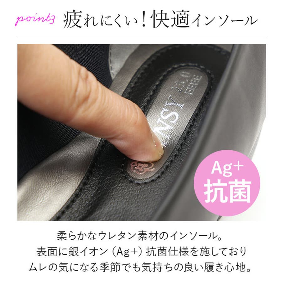・インソールには長時間歩いても疲れにくい、柔らかなウレタン素材を使用。さらに中敷表面層に銀イオン(Ag+)抗菌剤を練り込み、いつでも清潔で気持ちの良い履き心地。