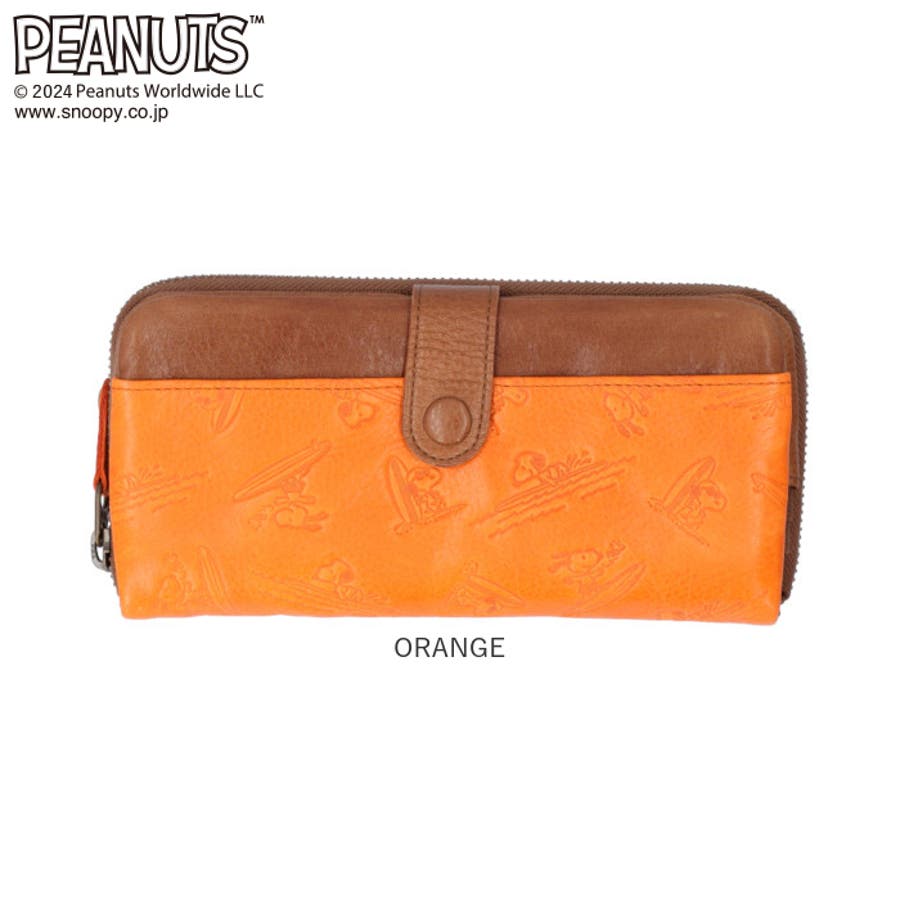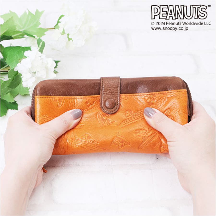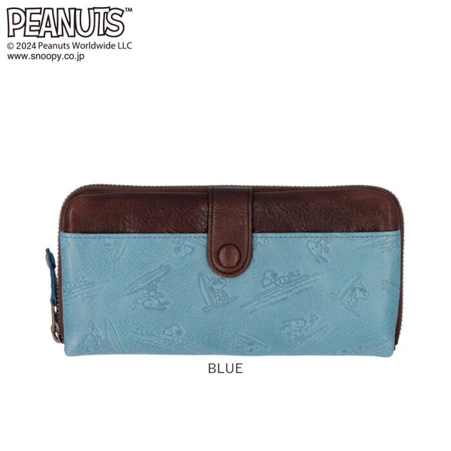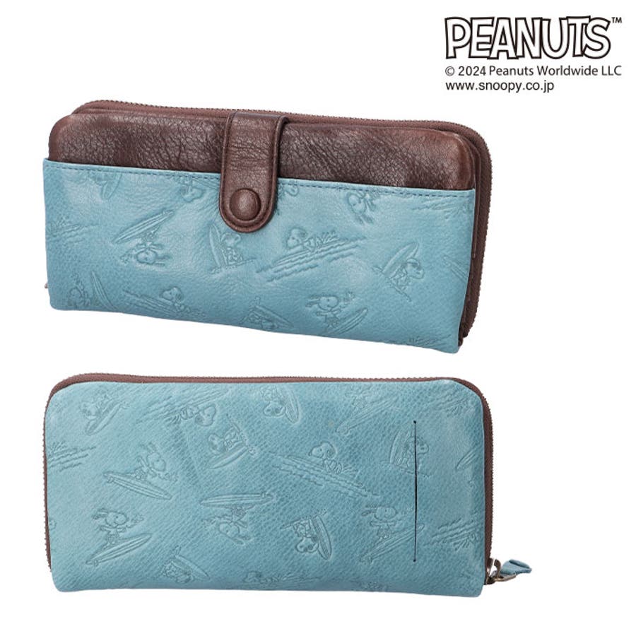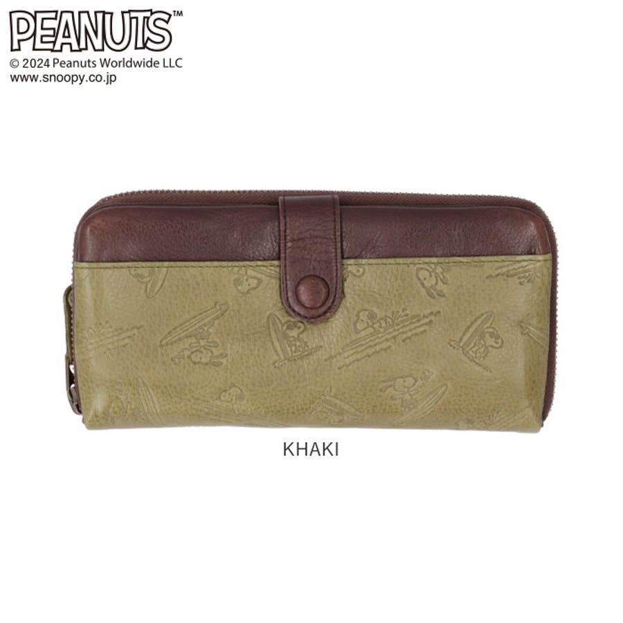 ※大人から子どもまで世界中から愛されるPEANUTSアートを大人の革小物にアレンジ。サーフボードにのって楽し気に波を乗りこなす、スヌーピーのイラストを型押しした遊び心あふれるデザイン。
