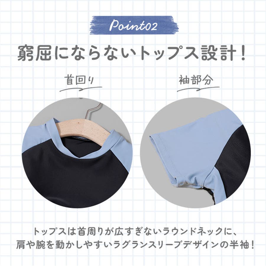 ・トップスは首周りが広すぎないラウンドネックに、肩や腕が動かしやすいラグランスリーブデザインの半袖タイプ。