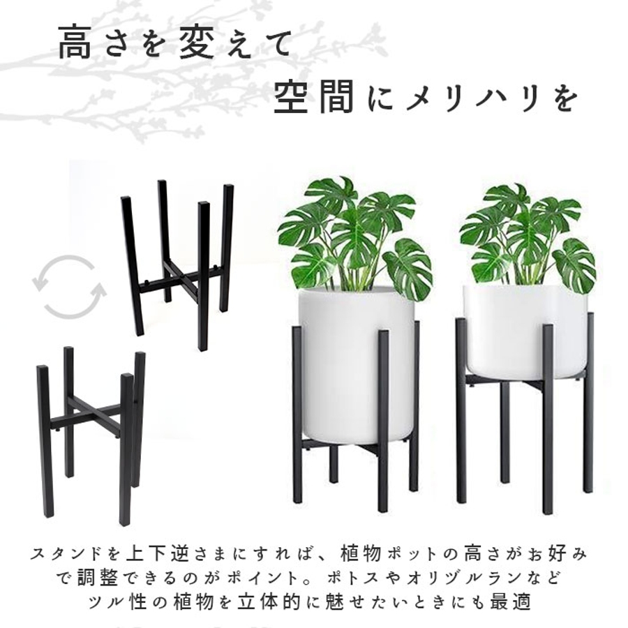 ・さらに、スタンドを上下逆さまにすれば、植物ポットの高さがお好みで調整できるのがポイント。ポトスやオリヅルランなど、ツル性の植物を立体的に魅せたいときにも最適。
