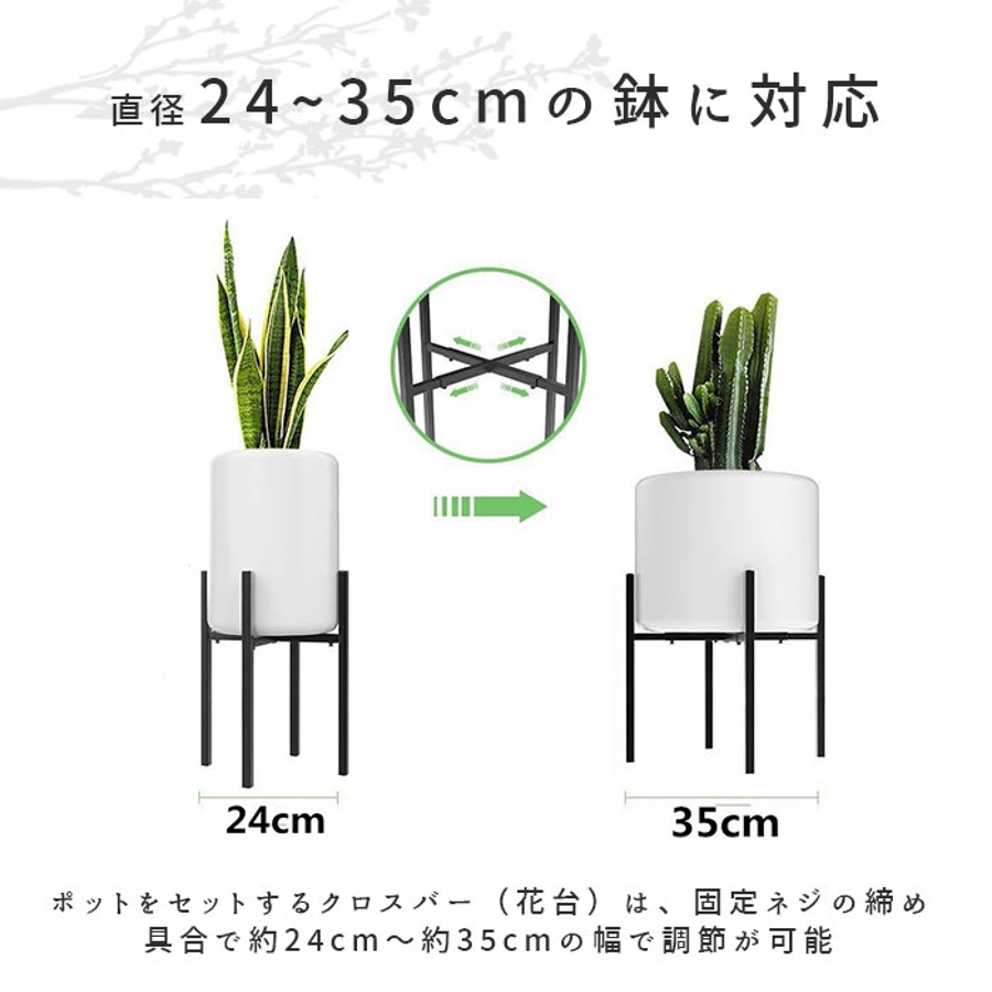 ・ポットをセットするクロスバー(花台)は、固定ネジの締め具合で約24cm~約35cmの幅で調節が可能。